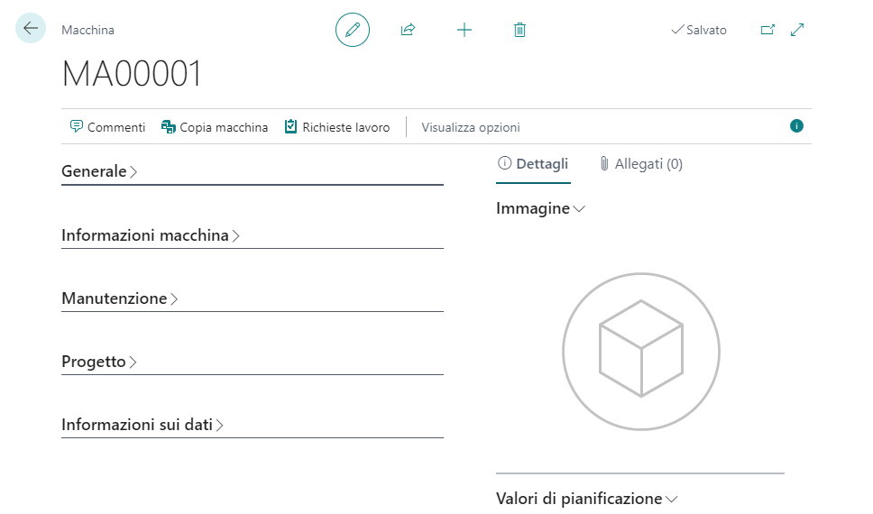Contiene informazioni generali sulla macchina, come il produttore, la data di acquisto, di installazione, di garanzia e così via.