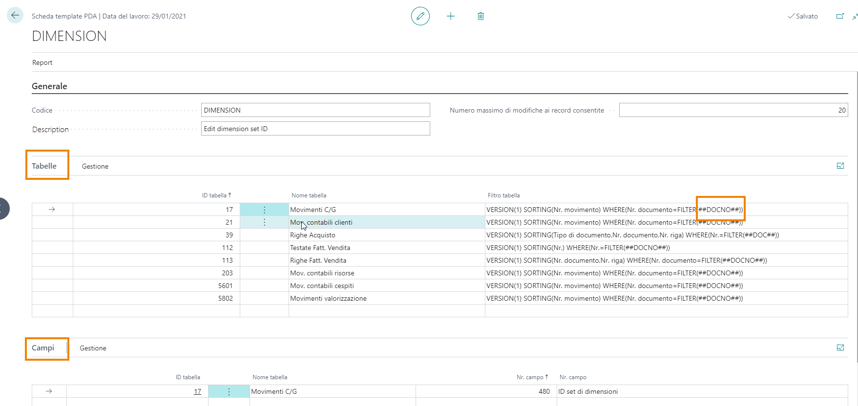 Nella page Template (PDA) vanno innanzitutto impostati dei template con l’elenco delle tabelle e dei campi sul quali sarà necessario filtrare: