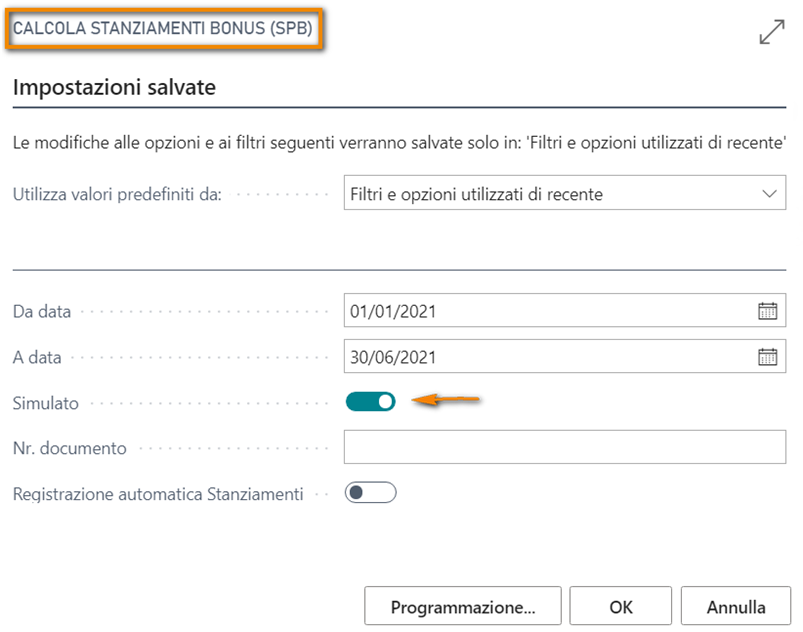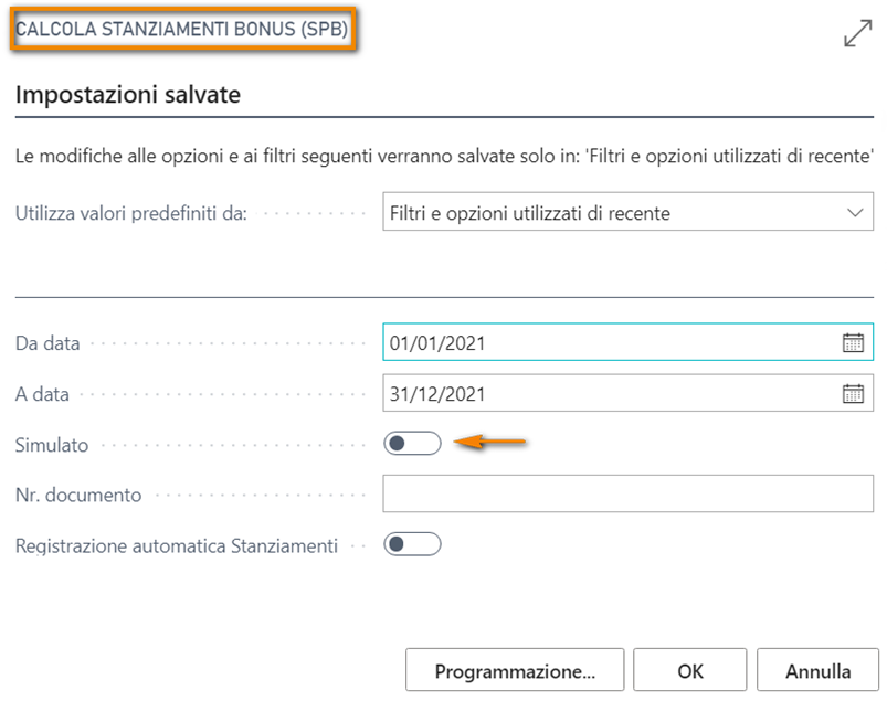 - Simulato: viene proposto a ‘sì’ se nel “Setup bonus (SPB)” è valorizzato il campo “Template Def. Stanziamenti Sim.”. Questa opzione è solo disponibile se l’app SGL è installata.