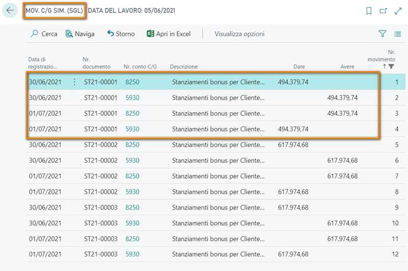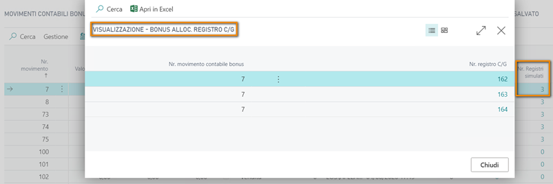 Il movimento contabile bonus presenta il campo “Nr. registri simulati” attraverso il quale è possibile consultare i registri generati e le relative scritture simulate auto stornanti.