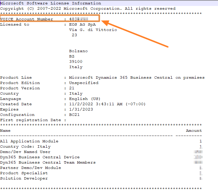 | Licenze di Sviluppo (Aka Development License) fornite da Microsoft ai Partner Dynamics sono bloccate da EOS. Per utilizzi di sviluppo e Demo viene generato un codice RANDOM di 32 caratteri al posto dei codice da 7 numeri. Per gli ambienti Dev e Demo vengono attivati solo periodi Trials. |